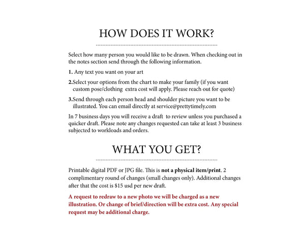 Select how many person you would like to be drawn. When checking out in the notes section send through the following information.