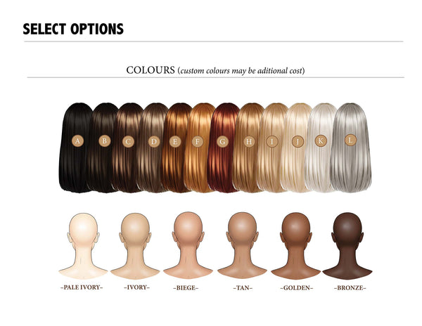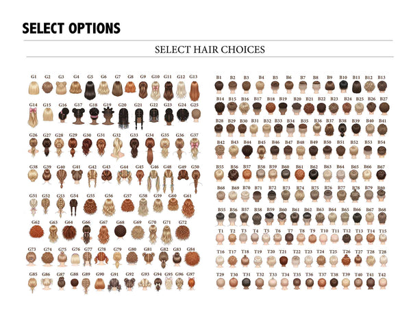- Hairstyles and hair color (from chart - additional cost if you want custom hairstyle)